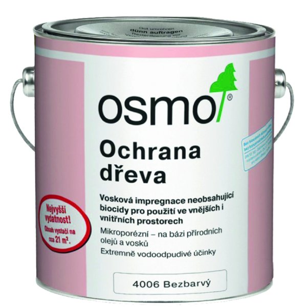 OSMO – OCHRANA DREVA je impregnácia bez biocídov, určená najmä pre aplikáciu vo vlhkých priestoroch a miestnostiach. Číra impregnácia dreva je na báze prírodných olejov, voskov bez biocídov a konzervačných látok. Preventívne chráni drevo proti modraniu a proti plesňovým hubám narušujúcim náter. Okrem toho silno odpudzuje vodu. Suchý povrch je bezpečný pre ľudí, zvieratá a rastliny podľa DIN 53 160. Náter je vhodný pre detské hračky EN 71.3.