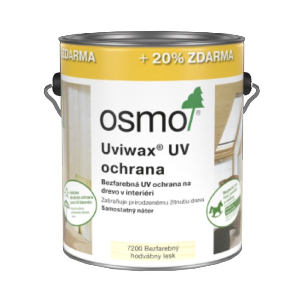 OSMO – UVIWAX® UV OCHRANA je vosková povrchová úprava pre použitie v interiéroch. Chráni lignín v dreve pred škodlivým UV žiarením. Prirodzené žltnutie dreva je výrazne znížené a prirodzený, tón dreva sa zachováva dlhšie. Osmo Uviwax® UV ochrana je vodoodpudivý a oderu odolný a vytvára na dotyk príjemný povrch. Náter nepraská, neolupuje sa. Suchý povrch je bezpečný pre ľudí, zvieratá a rastliny podľa DIN 53 160. Náter je vhodný pre detské hračky EN 71.3.
