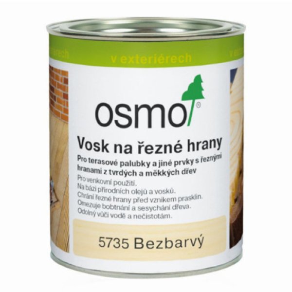 OSMO – VOSK NA REZNÉ HRANY je špeciálny prípravok na ochranu rezných hrán proti nasiakavosti vlhkosti a tvorbe prasklín. Minimalizuje nasávanie vody, ale aj vysušovanie rezných hrán. Chráni drevo zvnútra, pretože dochádza ku kapilárnemu vstrebávaniu. Zabraňuje napučaniu a vysychaniu dreva a obmedzuje výron látok obsiahnutých v dreve.