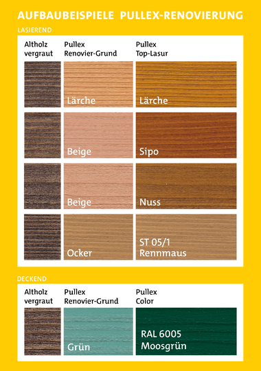 Polokrycí, impregnačný základný náter na drevo na renováciu silne zvetraných drevených povrchov vo vonkajšom prostredí. Renovačný základ na drevo vonku Pullex Primer-Reno nielen spevňuje, ale tiež zjednocuje a zosvetľuje drevený podklad a účinne ho pripravuje na vrchný náter farbou alebo lazúrou vo zvolenom odtieni